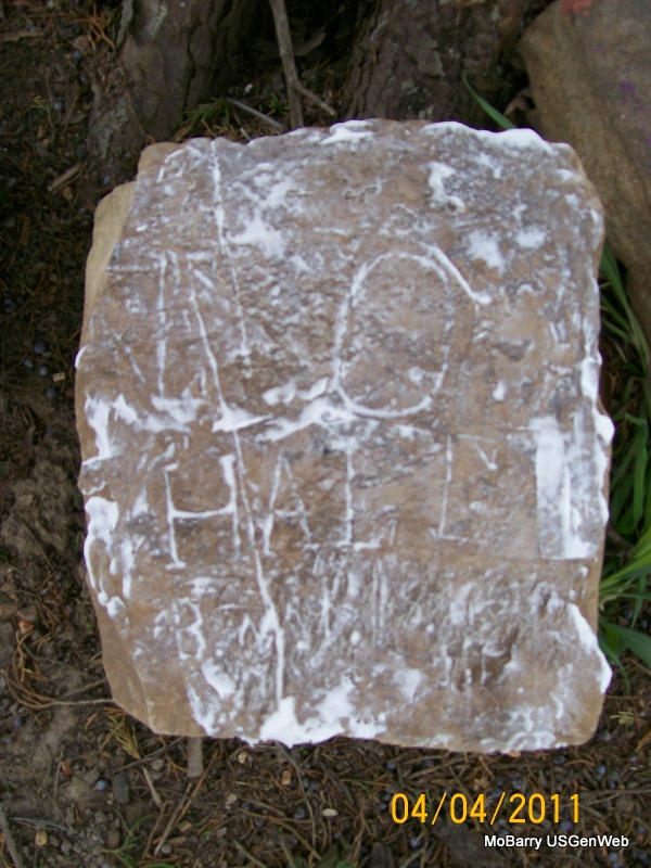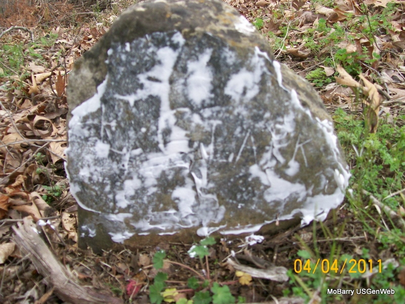 Research Note: Moved to Philibert Cemetery. - Turner Ogburn Hale moved to Barry County in 1853 from Carroll County, TN. Turner was born in Hawkins Co., TN, son of Ogburn Hale of Norfolk Co., VA. Turner's wife was Sarah Butler, who died after 1870. Turner died April 28, 1881 and was buried on his farm, along with 16 other family members. - Gary's note: The Corps of Engineers only moved 4 graves over to Philibert Cemetery in Stone County, Turner's being one of them, as well as one of his sons, Ellias Ogburn Hale, his son in law, Elijah Clark, one unmarked and one with initials of TJB. | Note Gary Hale Photo Jay Trace |