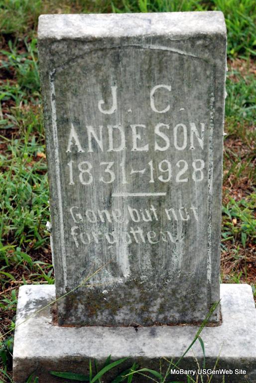 Research Note: Stone reads Andeson. This is likely John Elmore who is buried by his first wife, Charity. His second wife is buried in Kings. Anderson family members state that their records indicate that John Elmore died in 1927. No death certificate could be located, but his stone reads 1928. Also the stone reads J. C. and not J. E. for John Elmore. He is buried by Mrs. C. P. Anderson. | Note Donna Cooper Photo Cindy Marcell |