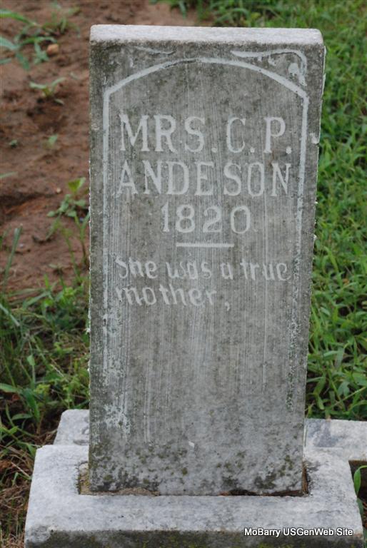 | Anderson, C. P., Mrs. | 1820 | No Date | Inscription: "She was a true mother" - Research Note: Stone reads Andeson. She is buried by J. C. Anderson. | Note Donna Cooper Photo Cindy Marcell |