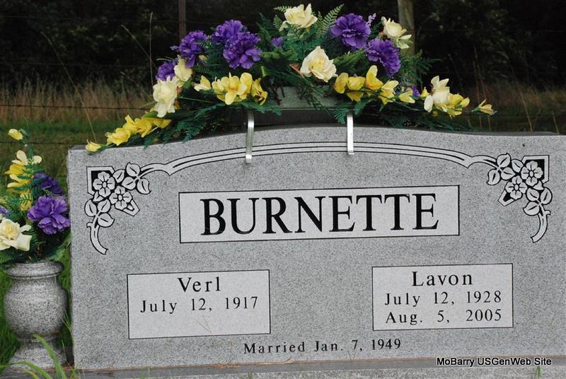 SSW: Lavon - Inscription: "Married Jan. 7, 1949" - Research Note: Verl was a son of Thomas Douglas and Annie Viola (McNabb) Burnette, and his grand parents were John Talbert and Susan Ellen (Masoner) Burnette, who came to Barry County from Stanberry, Gentry Co., MO. His parents are buried in Antioch and his grandparents in Concord. Verl's maternal grandparents were Peter Henderson Catron and Anna England buried at Antioch. Peter was a Civil War Veteran. Company, C or E, Regiment, 1 TN Cav. and served 3 years. Verl was a WWII Veteran. - On January 7, 1949, in Bentonville, Arkansas, he was united in marriage to Lavon Dodson, who preceded him in death on August 5, 2005. Also preceding him in death were his parents; three brothers, Eugene, Brice and Gaylord Burnette and one sister, Maxine Blythe. He received his education at Washburn. During World War II he was honored to serve in the United States Army as a Staff Sergeant. For several years he was employed for Dairy Craft in Monett as an evaporator operator. For twelve years he worked at Roaring River State Park, enjoying every minute. | Note Donna Cooper Fohn Funeral Home Phyllis Long Photo Cindy Marcell |