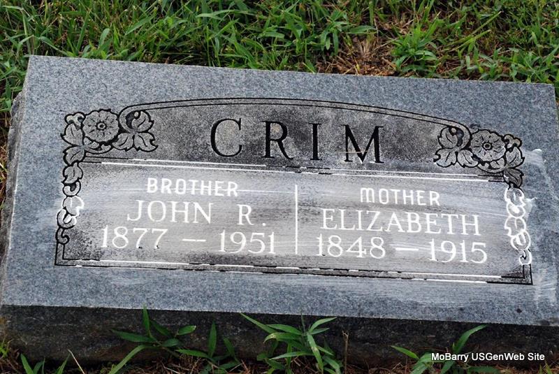 SSW: John R. - Inscription: "Mother" - Research Note: Daughter of Isaac Brisco and Martha Durham. Elizabeth Brisco married W. B. Crim on Nov. 16, 1874 in Barry Co., MO. John R. was her son. - August 19, 1915, Cassville Republican - Est. Elisabeth Crim, dec'd John Crim, appointed administrator. Bond of $300 approved. | Online Newspapers Donna Cooper Census MO Marriage Records Phyllis Long Photo Cindy Marcell |