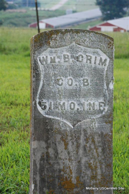 Inscription: "Co B 51 Mo. Inf" - Research Note: Buried in Bradley Cemetery. He married Elizabeth Brisco in 1874. Children: John, Levi W., Maud L., and Snow F. Crim, all born near Washburn. He was a son of William S. and America (Bradley) Crim. Grandson of Luke Bradley. His father was born in TN and his mother in IN. - Cassville Republican, Jan. 28, 1915 - Washburn News: William Benton Crim died Friday, Jan. 15, at his home west of town of paralysis, age about 60 years. He leaves a wife and six children to mourn his death. They are Levi, Charles, John, Will of this place, Maude and Mrs. Matt Brewer of Seligman. Funeral services were conducted at the Union Church Saturday afternoon by Rev. Bishop and burial was made at the cemetery west of town. Mr. Crim was an old citizen of Barry County and a member of the M. E. Church, a regular attendant when his health would permit. The community extends sympathy to the bereaved family. | Note Online Newspapers Gerald Haddock Photo Cindy Marcell |