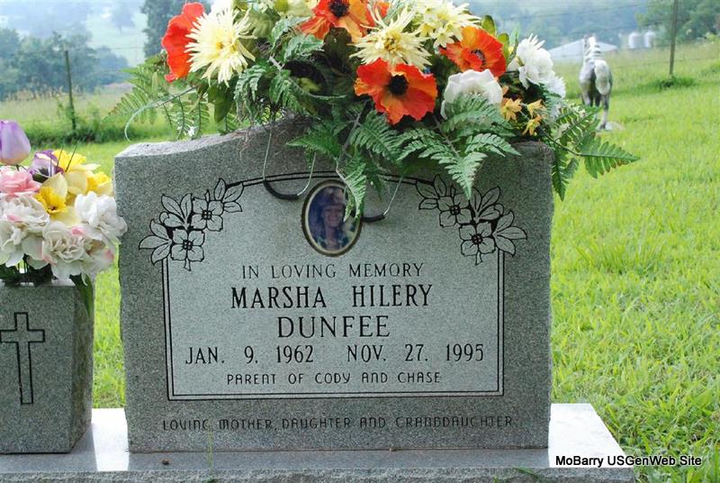 | DUNFEE, Marsha (HILERY) | Jan. 9, 1962 | Nov. 27, 1995 | Inscription: "Parent of Cody and Chase, Loving Mother, daughter and granddaughter" - Research Note: Raised by her grandparents, Everett Earl and Neoma (Banks) Hilery. Biological mother was Glenda Hilery. | Headstone Mary Homesley Note Phyllis Long Photo Cindy Marcell |