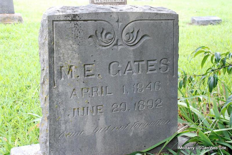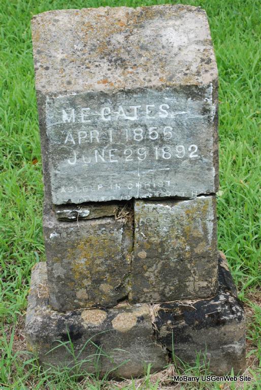 Research Note: She was the wife of James William Gates and one of her daughters was Sinia Alice Gates and she was married to William Calvin Hancock. Daughter of Harrison Casebolt and Rachel Archer. Mary's older stone has April 1, 1856 for the birth date and the newer on has 1846. The death date was reported in the paper as the 30th, but both stones have the 29th. It appears that the 1846 date is the correct one based on the obit. - Cassville Republican, July 7, 1892 - Washburn News: Thursday, June 30th, Mrs. Mary Gates, at the age of 44 years, 8 months, and 9 days, entered her rest. Mrs. Gates had been down sick for about ten weeks and had not enjoyed good health for about seventeen years. In her last days on earth she told her sorrowing friends that she did not fear death as she was prepared to meet the Lord. She had lived a devoted member of the Christian church for twenty-two years. She leaves, besides a host of warm friends, a husband and four children to mourn her loss. Her remains were interred at the Boren Graveyard, Friday, July 1st. - Another Stone | Note Online Obit Census Donna Cooper Photos Cindy Marcell |