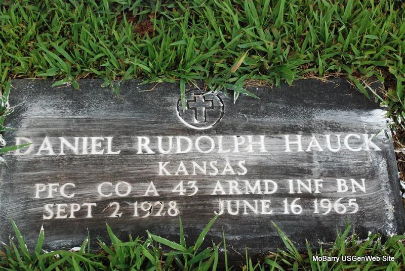 | HAUCK, Daniel Rudolph | Sept. 2, 1928 | June 16, 1965 | Inscription: "KANSAS PFC Co A 43 Armed Inf BN" - "Parent of Zenda and Rita" - Research Note: He first married Bernice Banks and then she later married Ralph McAllister. - Another Stone | Note Donna Cooper Photo Cindy Marcell |