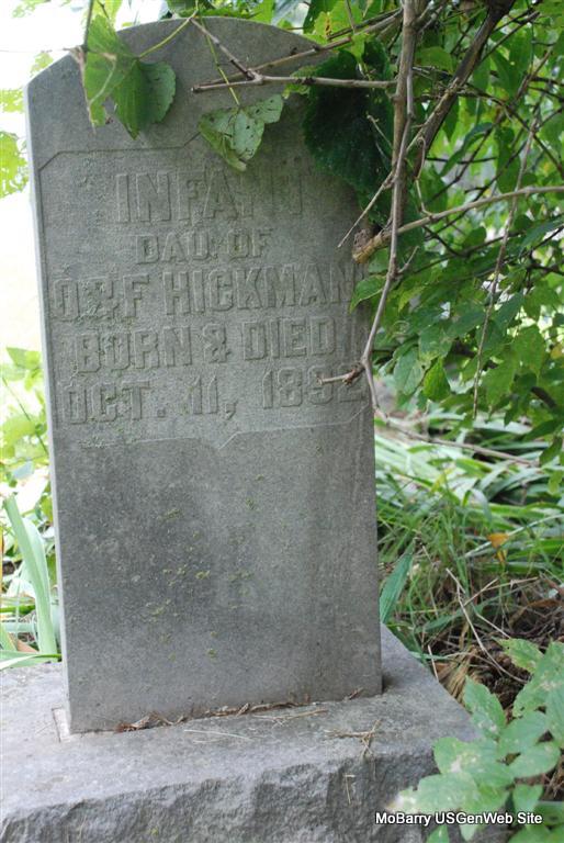 | HICKMAN, Infant | Oct. 11, 1892 | Oct. 11, 1892 | Inscription: "Infant Dau. of O. and F. Hickman" | Photo Cindy Marcell |