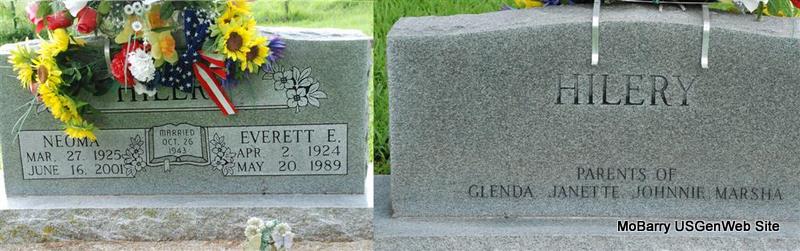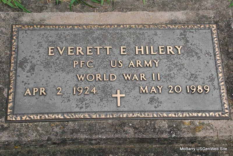 | HILERY, Everett Earl | Apr. 2, 1924 | May 20, 1989 | SSW: Neoma - Inscription: "Married Oct. 26, 1943" - Another Stone - Inscription: "PFC US ARMY WWII" | Headstone Mary Homesley Photos Cindy Marcell |
