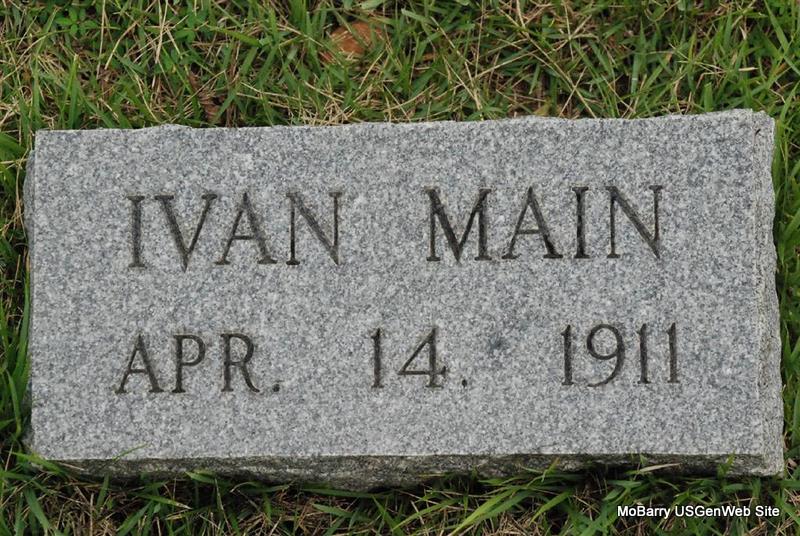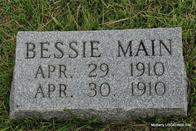 | MAIN, Bessie | Apr. 29, 1910 | Apr. 30, 1930 | Research Note: Bessie, Harold, Ivan, Marvin, and Vera all have matching stones. | Note Phyllis Long Photo Cindy Marcell |