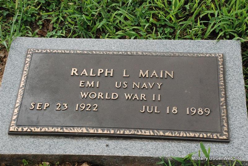 | MAIN, Ralph Leon | Sept. 23, 1922 | July 18, 1989 | Inscription: "EMI US NAVY WORLD WAR II" - Research Note: Son of Samuel Lane Main and Bertha Lena Poe. His wife was Helen Naomi Main. | Census Phyllis Long Photo Cindy Marcell |
