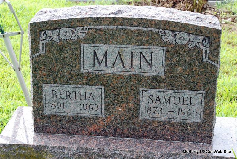 SSW: Bertha - Research Note: Son of Benjamin Franklin Main and Nancy C. Brunson, both buried at Washburn Prairie Cemetery. Orville Main of Washburn, MO was the informant on the death certificate. Usual residence was Washburn, MO. | Death Certificate Phyllis Long Census Photo Cindy Marcell |
