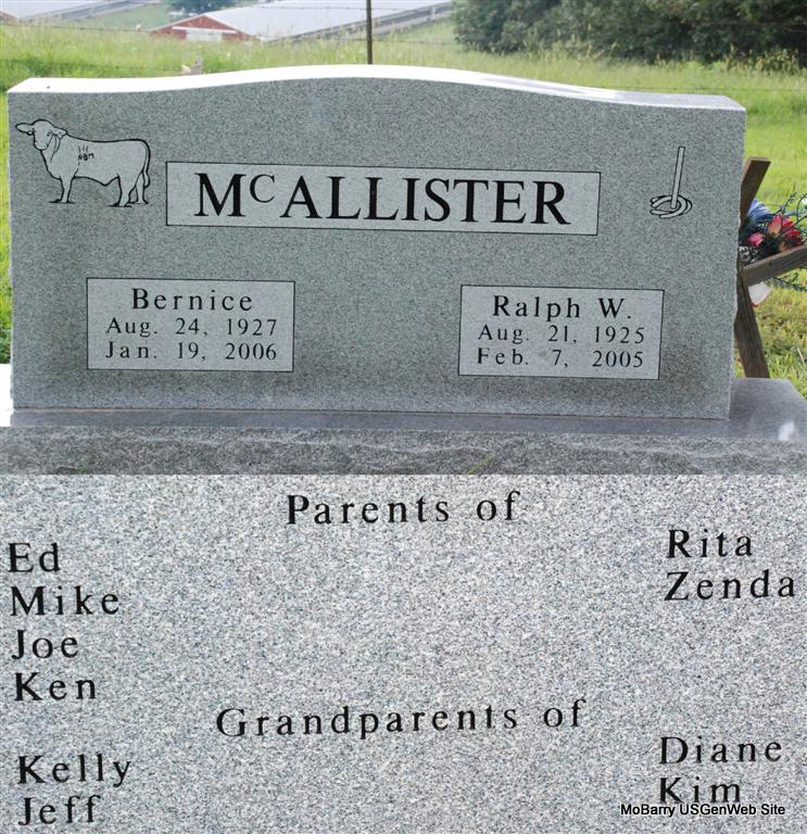 SSW: Beatrice - Research Note: He was a son of Edward M. and Lila E. (Winton) McAllister. Donna's Note: Ralph William McAllister, age 79, of Washburn, died February 7, 2005, at Red Rose Inn in Cassville. He was born August 21, 1925, in Henry County, MO and was a son of Edward M. and Lila E. (Winton) McAllister. He worked for Burlington Northern Railroad for 38 years and was a cattle farmer. He was a member of Brotherhood of United Transportation Union, Red Brangus Association, Missouri Horseshoe Pitchers Association, Tribe of Mic-O-Say, and the Baptist Church. He married Hazel Neel in 1943. He married Bernice (Banks) Hauck on June 12, 1974. | Monett Times Mary Homesley Photo Cindy Marcell |