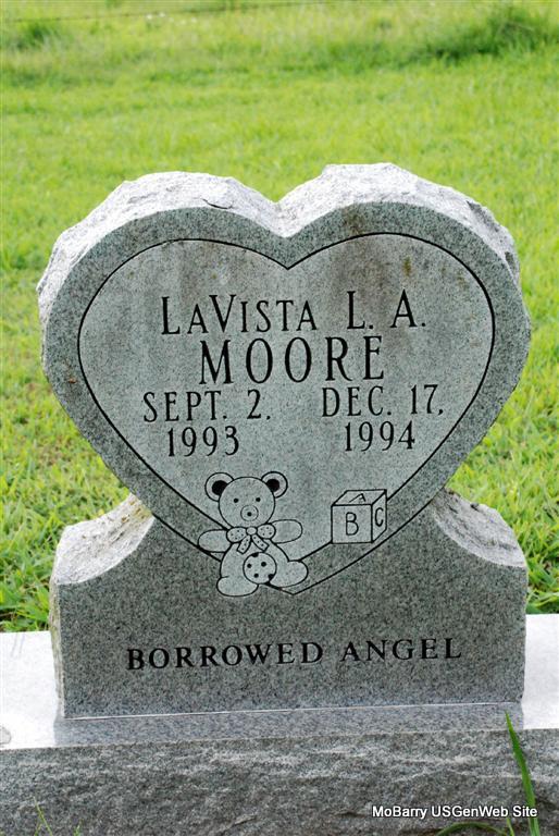 | MOORE, LaVista L.A. | Sept. 2, 1993 | Dec. 17, 1994 | Inscription: "Borrowed Angel" | Headstone Mary Homesley Photo Cindy Marcell |