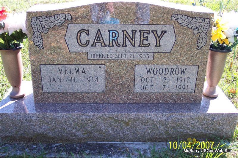 SSW: Woodrow - Inscription: "Married Sept. 21, 1935" - Research Note: Daughter of Arthur E. Moreland and Mary Elizabeth Collins. Velma Moreland, age 21, married Woodrow Carney, age 23, on Sept. 21, 1935 in Mt. Vernon, Lawrence Co., MO. | Census MO Marriage Records Phyllis Long Photo Diana Cope |