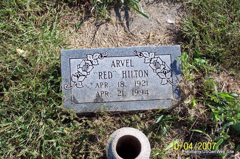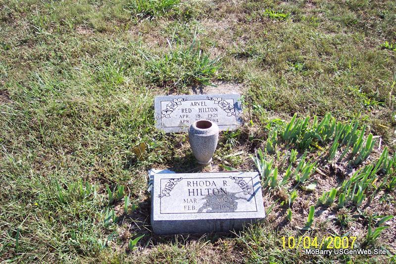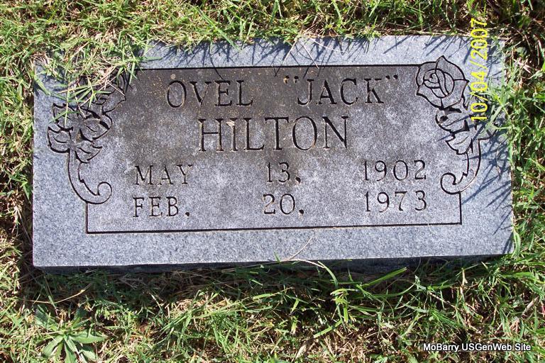 | HILTON, Ovel "Jack" | May 13, 1902 | Feb. 20, 1973 | Research Note: On one side of him is Amanda Short Hilton and on the other side a metal marker without a name. Son of Columbus Hilton and Amanda (Lasiter) (Short) Hilton. Ovel Hilton, age 53 of Galena, Stone Co., MO, married Opal Montgomery, age 40 of Elsie, Stone Co., MO, on at the home of M. L. Montgomery. | Census MO Marriage Records Phyllis Long Photos Diana Cope |