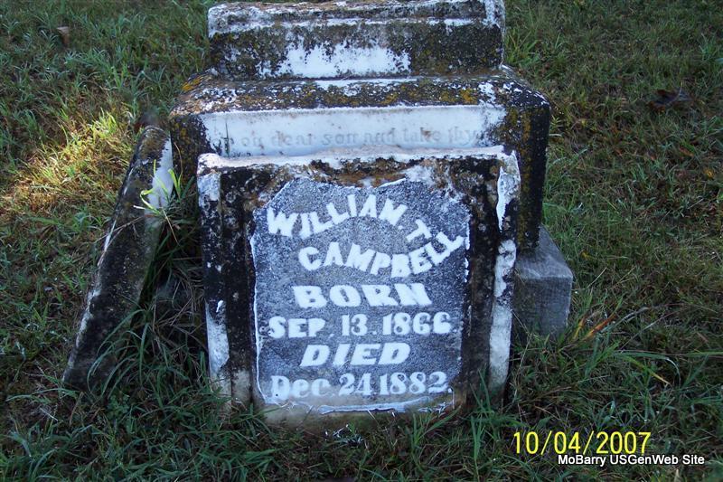 | CAMPBELL, William T. | Sept. 13, 1866 | Dec. 24, 1882 | Research Note: Stone is broken and in three pieces. Son of Joseph W. Campbell and Nancy Talbot. | Census Phyllis Long Photo Diana Cope |
