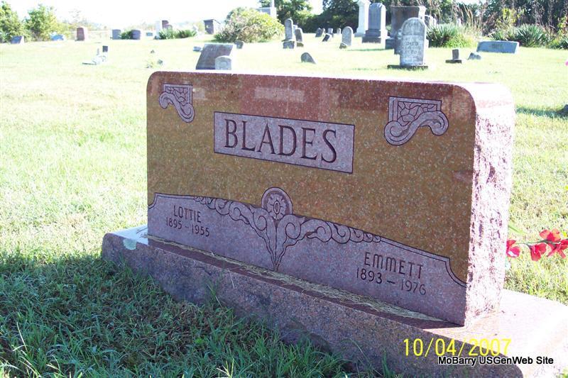 SSW: Lottie - Research Note: Son of George Elisha Blades and Dora A. McDaniel. Dora died in 1895 and Emmett and his sister are living with their grandparents, James R. Blades and Louisa Rickman, in the 1900 census. Emmett F. Blades first married Lottie Hilton on Feb. 2, 1912 in Stone Co., MO. Emmett Floyd Blades, age 61, second married Flossie Simpson, age 43, in Mt. Vernon, Lawrence Co., MO. | MO Marriage Records Census Phyllis Long Photo Diana Cope |