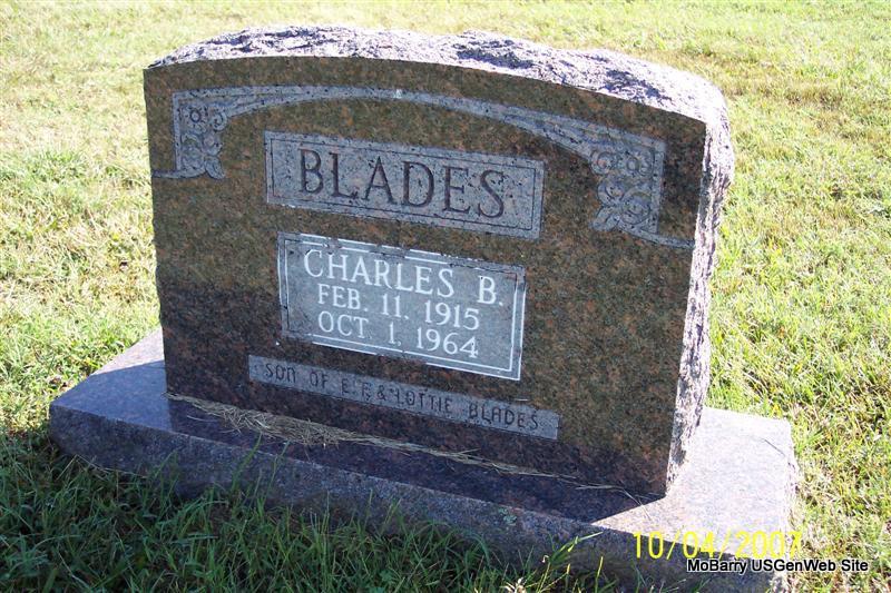 | BLADES, Charles B. | Feb. 11, 1915 | Oct. 1, 1964 | Inscription: "Son of E. F. and Lottie Blades" - Research Note: Son of Emmett Floyd Blades and Lottie Hilton. | Census Phyllis Long Photo Diana Cope |