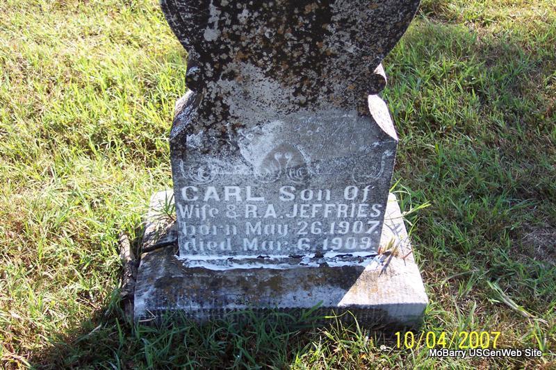| JEFFRIES, Carl | May 26, 1907 | Mar. 6, 1909 | Inscription: "Carl Son of Wife and R. A. Jeffries" | Photo Diana Cope |