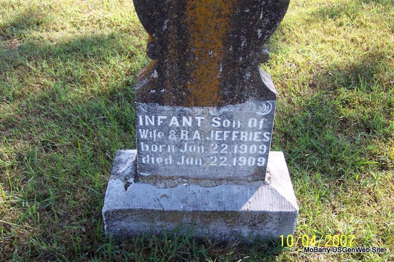 | JEFFRIES, Infant | Jan. 22, 1909 | Jan. 22, 1909 | Inscription: "Infant Son of Wife and R. A. Jeffries" | Photo Diana Cope |