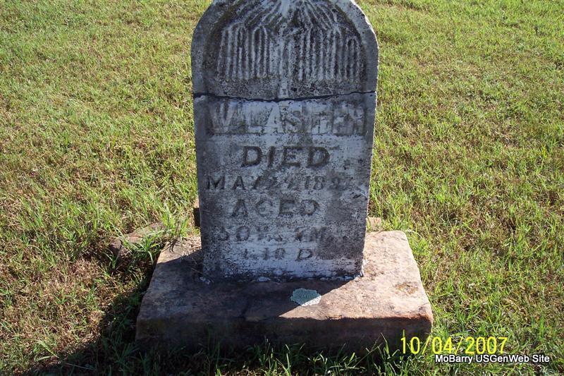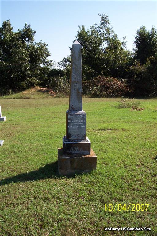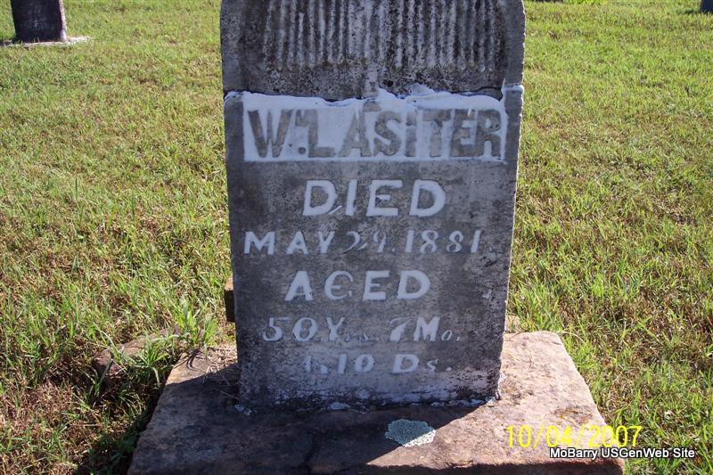 Inscription: "Age 50 Yrs. 7 Mos. and 10 Ds" - Research Note: According to the age given he would have been born Aug. 8, 1830 or there about. Civil War Veteran. He was a private, Union, Capt. Moore's Co., Stone Co. Regiment, Missouri Home Guard. Son of Jotham Alexander Lasiter and Isabell Higgenbotham. William H. Lasiter married on July 10, 1852 in Rutherford Co., TN, to Susannah Mariah Rogers b. 1835 in Rutherford co., TN, d. 1901 in Stone Co., MO, daughter of Dean Rogers and Purity Davidson. - Another Photo | TN Marriage Records Census Civil War Records Phyllis Long Photos Diana Cope |