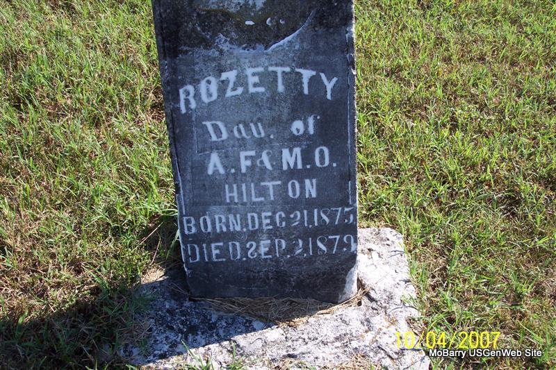 | HILTON, Rozetty | Dec. 21, 1875 | Sept. 2, 1879 | Inscription: "Dau. of A. F. and M. O. Hilton" - Research Note: Daughter of Adam Franklin Hilton and Martha Bacon. - Nearby Graves | Note Phyllis Long Photos Diana Cope |