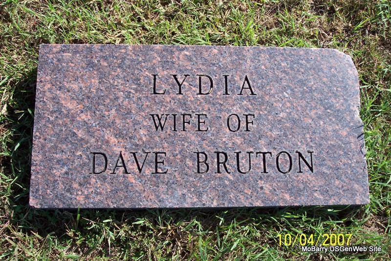 Inscription: "Lydia Wife of Dave Bruton" - Research Note: Lydia was age 3 in 1870 in the home of Mathew Nathan and Mary Susan (Merritt) Hilton. There is a death certificate on file with the Secretary of State's Office for a W. D. Bruton who died in 1925 buried in Masonic Cemetery in Stone Co., MO, with a wife named Lydia Susan. Perhaps this is the same family? - Researchers say her husband was William D. Bruton, born 1858 and died 1924. | Note Donna Cooper Photo Diana Cope |