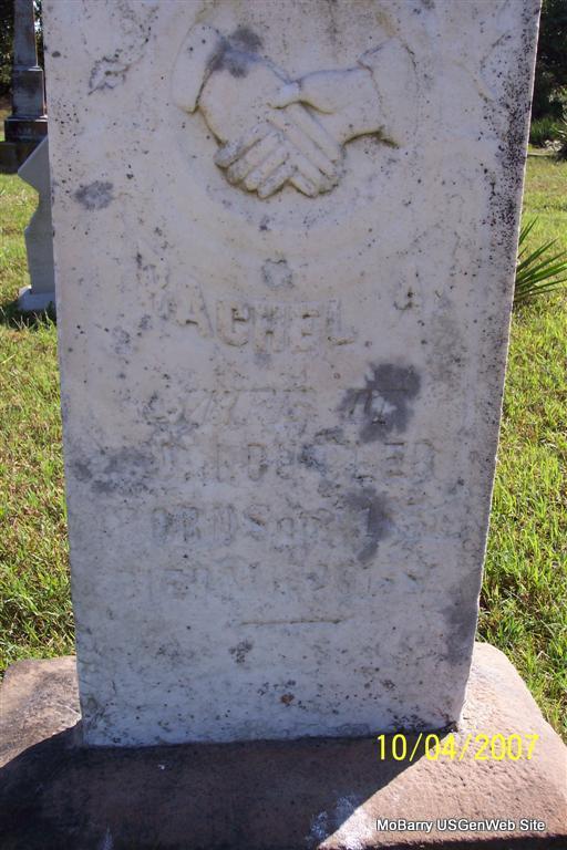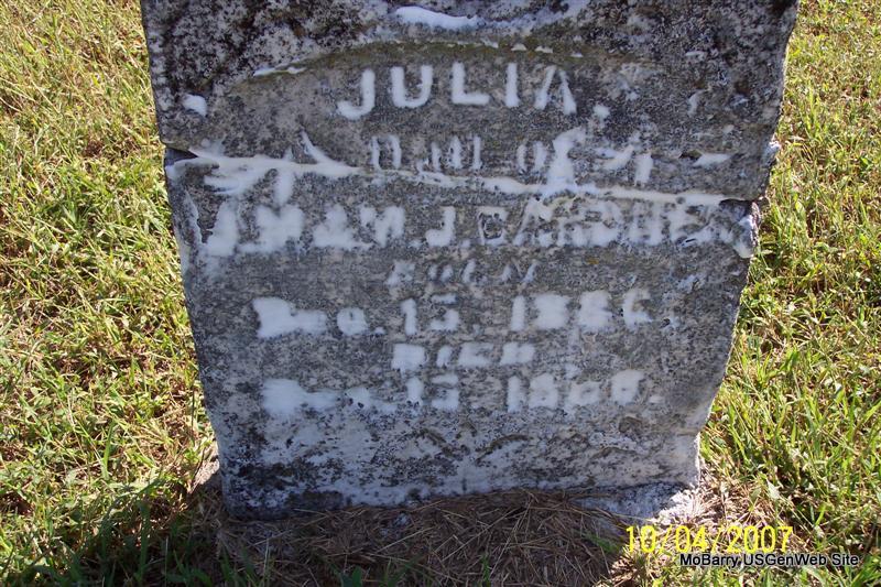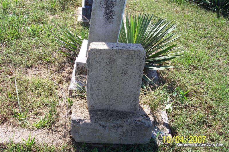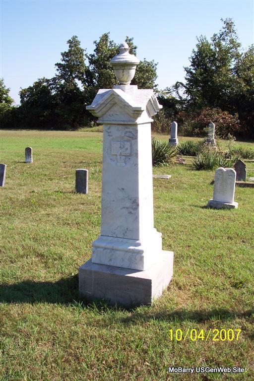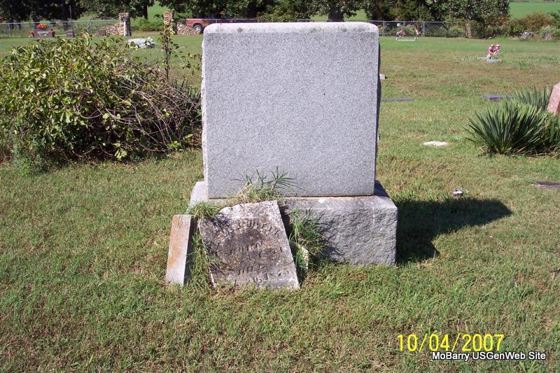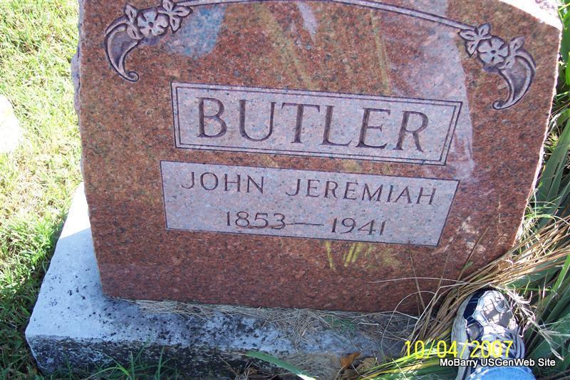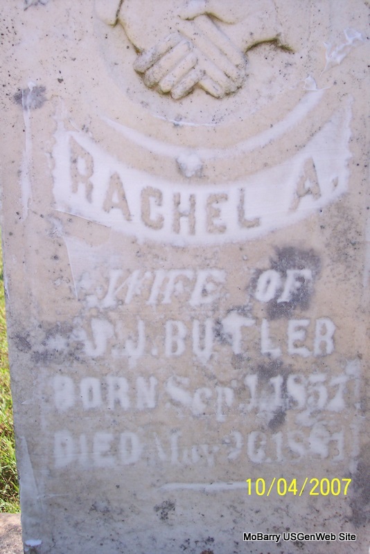 | BUTLER, Rachel A. (HILTON) | Sept. 1, 1857 | May 26, 1881 | Inscription: "Wife of J. J. Butler" - Research Note: Her parents were Matthew Nathan and Susan Mary (Merritt) Hilton. She married Jeremiah Butler on Dec. 10, 1876, Barry Co., MO. - Another Photo | Note Donna Cooper Photos Diana Cope |