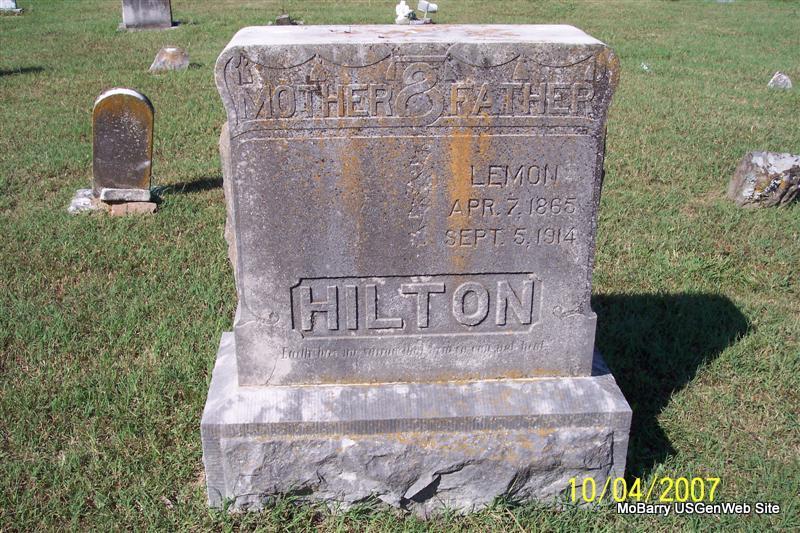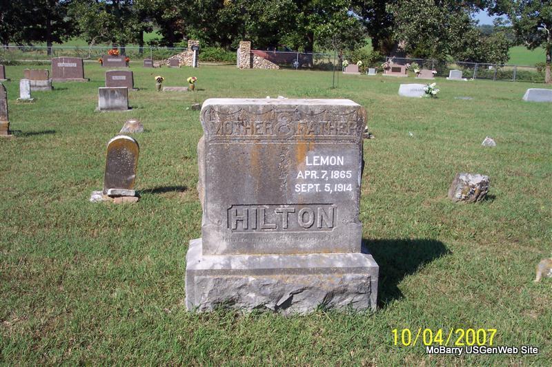 Research Note: This is a double stone but the other side is blank. His wife was Mary Elizabeth Maddox. His death certificate states that his father was William Hilton, born VA, and Elizabeth Owen. He was listed as married, age 49 years old. He was a live stock raiser. William Hilton of Scholten, MO, gave the information. He was a married farmer, died at age 49 years, 4 months, 28 days of acute gastric ulcer. - Cassville Republican, September 10, 1914 - Saturday morning about 8 o'clock, Lemon Hilton of Crane Creek township died after a short illness of stomach trouble. Owing to his few days illness the announcement of his death came as a shock to his large acquaintance over the country. The deceased was a son of W. S. Hilton, an aged citizen, who is one of the early settlers of this county. He was born and reared in Crane Creek township and had lived in that locality all his life. Mr. Hilton was one of the most highly respected of men. He was one of Barry County's prominent farmers. He was the nominee of Judge for the Eastern district on the Democratic ticket. In his death the county loses one of its useful citizens. - Another Photo | Death Certificate Donna Cooper King Funeral Home Note Jay Trace Online Obit Phyllis Long Photos Diana Cope |