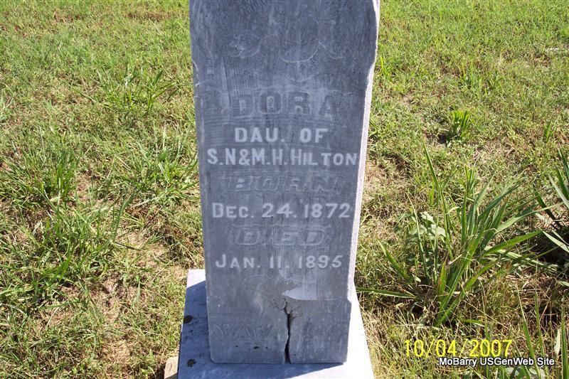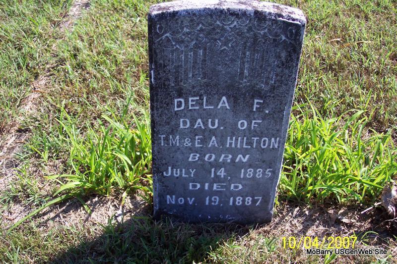| HILTON, Dela F. | July 14, 1885 | Nov. 19, 1897 | Inscription: "Dau. of T. M. and E. A. Hilton" - Research Note: Her parents were Thomas M. and Elizabeth A. (Gardner) Hilton. They are both buried in Osa Cemetery, Barry Co., MO. - Hilton Children | Note Donna Cooper Photos Diana Cope |