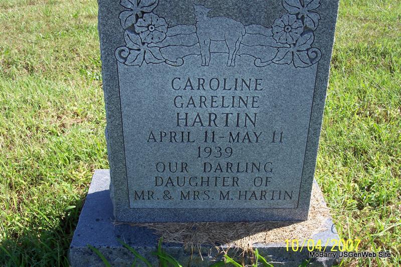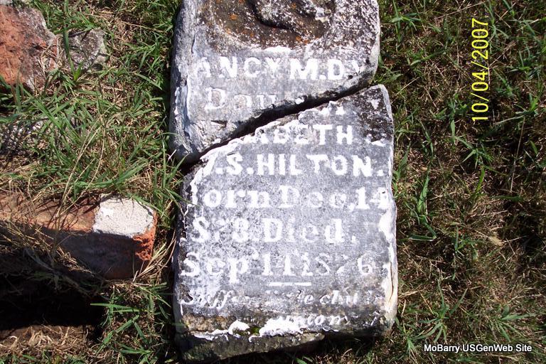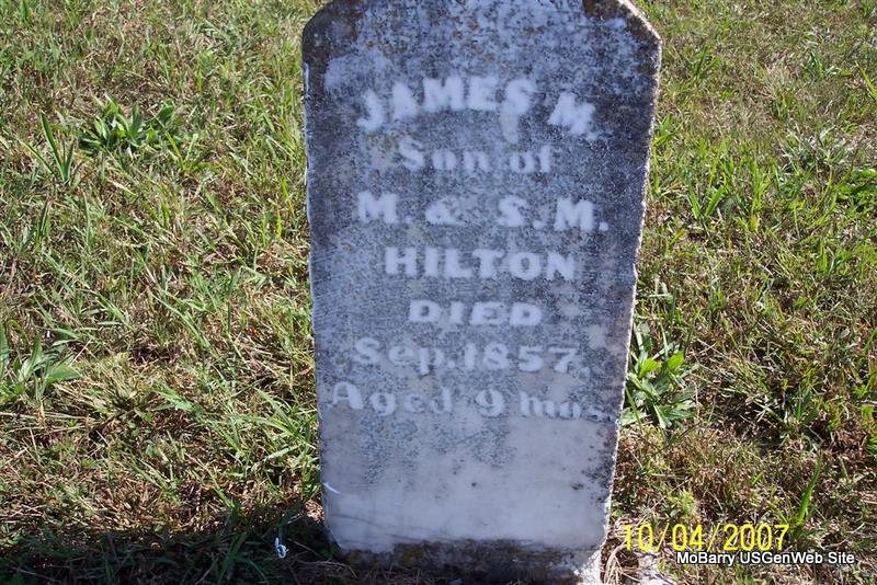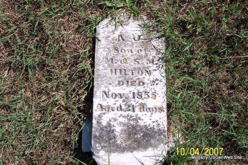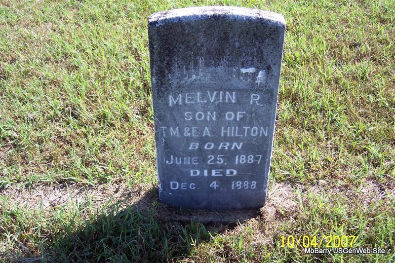 | HILTON, Melvin R. | June 25, 1887 | Dec. 4, 1888 | Inscription: "Son of T. M. and E. A. Hilton" - Research Note: His parents were Thomas M. and Elizabeth A. (Gardner) Hilton. They are both buried in Osa Cemetery, Barry Co., MO. - Hilton Children | Note Donna Cooper Photos Diana Cope |