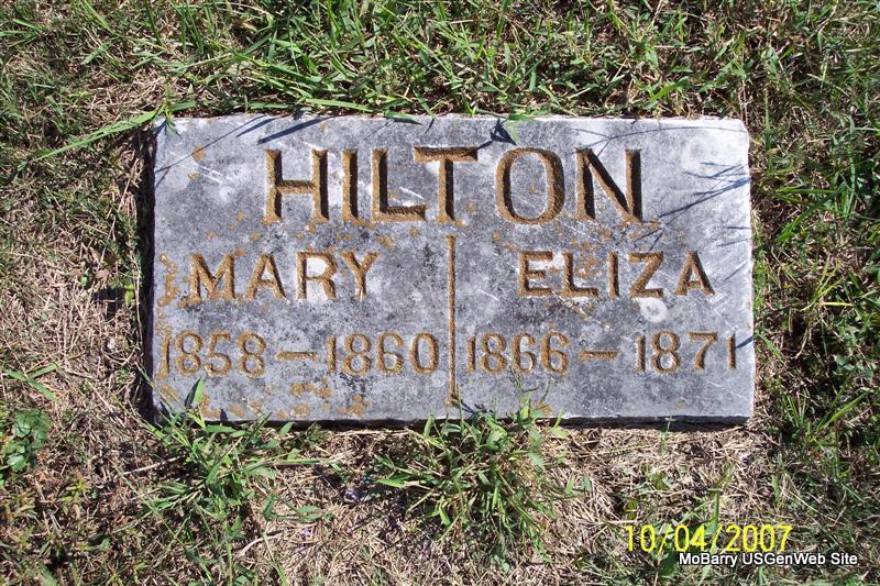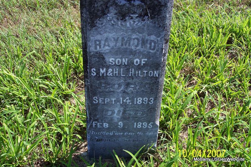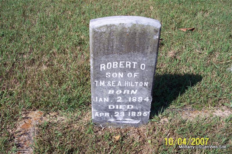 | HILTON, Robert O. | Jan. 2, 1894 | Apr. 23, 1895 | Inscription: "Son of T. M. and E. A. Hilton" - Research Note: His parents were Thomas M. and Elizabeth A. (Gardner) Hilton. They are both buried in Osa Cemetery, Barry Co., MO. - Hilton Children | Note Donna Cooper Photos Diana Cope |
