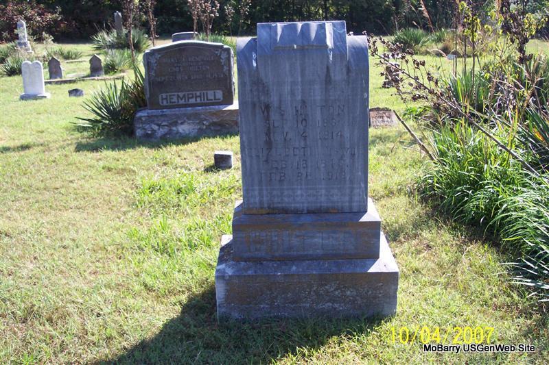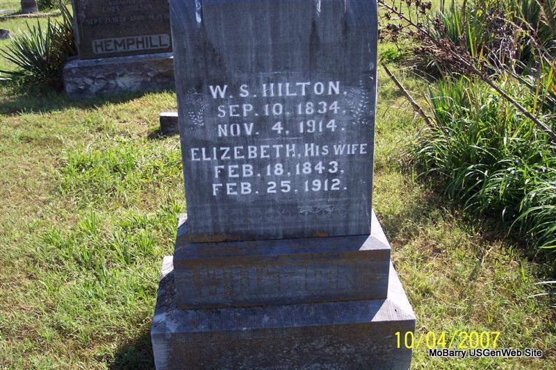 SSW: Elizabeth - Research Note: His death certificate reads that his father was Enos Hilton and that his mother was Annie Bailie. Both of his parents were born in VA. He was age 80 years, 1 month and 24 days old and died on Nov. 4, 1914 and was buried on Nov. 5, 1914 and was signed by the doctor on Nov. 4th. The state has it indexed as the 8th. It does look like that until you read the rest and then you can see that it was listed as the 3rd and signed on the 4th. King Funeral Home Records listed his death date also to be Nov. 4, 1914 and that he died of nephritis at age 80 years, 1 month and 24 days. If the age given is correct, then he died on the 4th as the stone reports. - Cassville Republican, Nov. 12, 1914 - Leann News: Uncle Bill Hilton, an old citizen of Leann, died Wednesday of last week of Bright's disease and was buried at the Hilton cemetery near Scholten Thursday. A Pioneer Citizen Dead: William S. Hilton of near Scholten, who has resided in this county since 1841, died Wednesday of last week after a long illness. The deceased was born in Scott Co., Va., September 19, 1834. When seven years of age he came to Barry County with his parents who settled near Scholten. His father, Rev. Samuel Hilton, was one of the early Baptist ministers of this county. In 1848 he was married to Elizabeth Owens. To this union were born eleven children. He was the father of Lemon Hilton, a well known citizen who died a few months ago. He was a veteran of the Civil War, giving two years service to the cause of the union. He was a prominent stockman and farmer and was one of the county's most highly respected citizen. - William Samuel Hilton married May 5, 1858 to Elizabeth Owen. - Goodspeed's History: William S. Hilton, stockman and farmer, of Barry Co., MO, was born in Scott Co., VA, Sept. 10, 1834, son of Enos and Anna B. (Bailey) Hilton, who were born in the Old Dominion, the former in 1800. He was a son of Rev. Samuel and Nancy (Short) Hilton. Our subject's grandfather, Samuel Hilton, came from NC to VA. He was a tiller of the soil and a Baptist preacher, and his father's people lived in NC, his father's name being Charles Hilton. William S. Hilton's paternal great-grandmother was a Miss Bird, who first married a Mr. Short, and four or five children were the result of this union. Then she married a Mr. Greene, and by the latter gentleman became the mother of one son, Gen. James Greene. Our subject's father, Enos Hilton, was twice married; the first time to Susanna Burkes, who died in Mar. 1833, leaving five children: Mathew, Marion, James, John, Matilda (widow of John Stubblefield). Mathew died at the age of fifty years; John at the age of fifty-eight years. The other three are still living, and reside in Barry Co. His second marriage was with Miss Anna B. Bailey, and nine children were the result of this union, eight of whom grew to maturity, and seven are now living: William, Ellen (Peters), Mary J. (Hemphill), Nancy (Neill), Sarah B. (Boren), Enos F., Eliza and Newton. Eliza died at about the age of sixteen. The father and mother were active members of the Church of God. The father was a teacher of the divine law. He began preaching about 1835, and in the fall of 1841 he left VA and came to MO, and in 1842 he moved to the place where he died. He formerly belonged to the Baptists and then joined the Church of God, and preached until death. He died Nov. 27, 1884. William S. was about seven years old when he came to MO with his parents. He grew to manhood in Barry Co., and received little educational advantages, owing to the scarcity of schools at that day. He remained at home until twenty-four years of age, at which time he married and located near the old home place, where he lived until 1864, then came to his present location, which is a farm of 160 acres, with about ninety under cultivation. He served in the Federal army for nearly two years under Capt. Moore, but was discharged in the spring of 1864, owing to disability. Elizabeth (Owen) Hilton, his wife, was born in Clay Co., IN, in 1843 and is the mother of eleven children, ten living: Missouri (Mullin), Marion, Lemon, Mary Ann (Suttles), Alfred, M. Rhoda, Harmon, Presley, Nancy, Wiley, and Armindia. Nancy died at the age of three years. Mr. Hilton and wife were members of the Church of God, and he belongs to the Farmer's Alliance. - Another Photo | Death Certificate Donna Cooper King Funeral Home Jay Trace Online Obit Goodspeed Phyllis Long Photos Diana Cope |