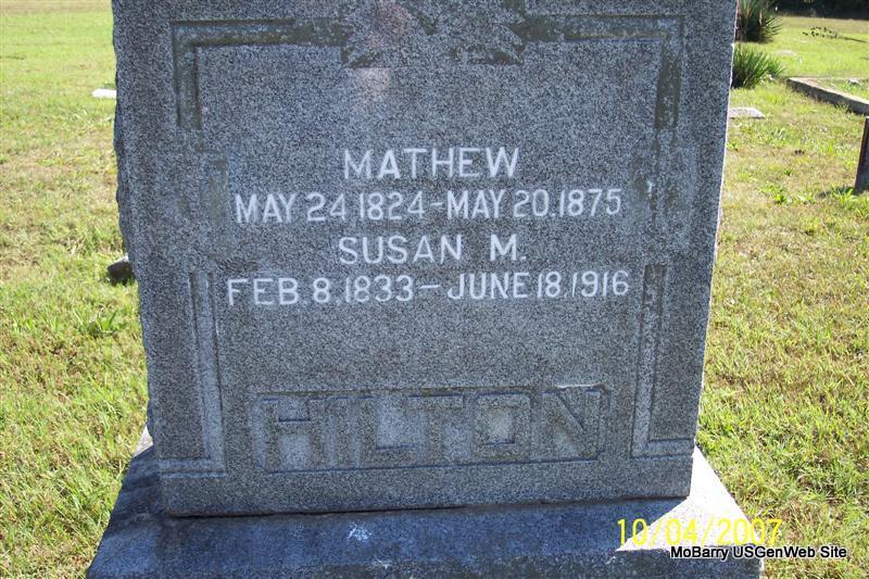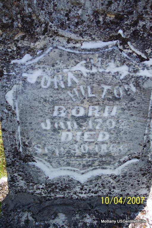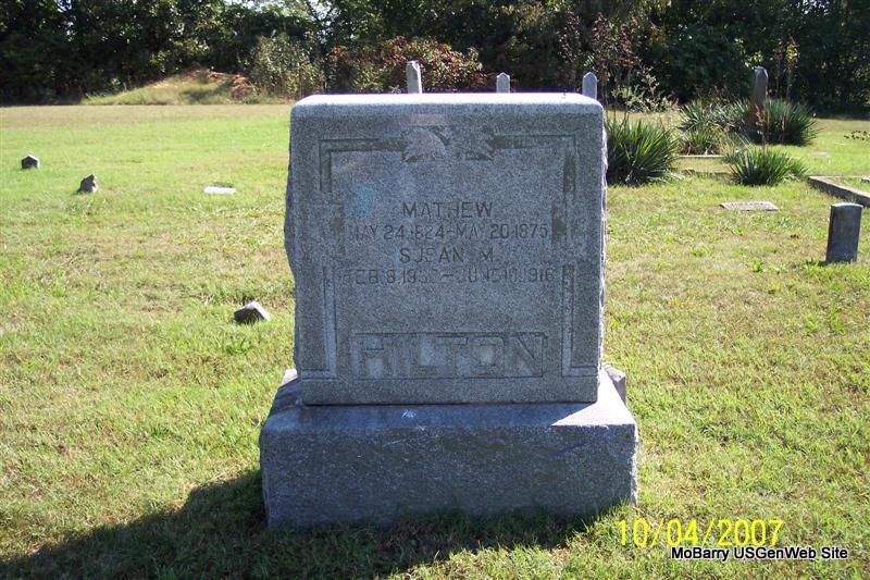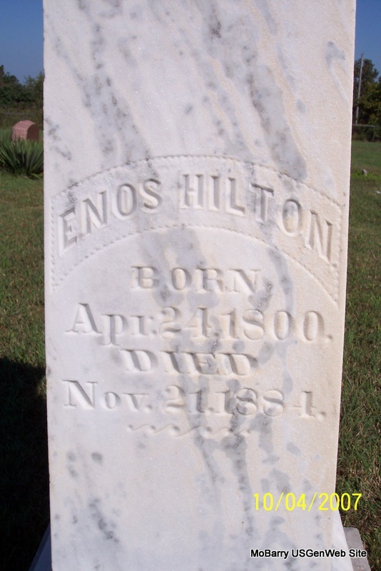 SSW: Susan M. - Research Note: Son of Enos Bird Hilton and Susanna Burke. His wife was Susan Mary Merritt. - Military Information: Capt. Moore's (Indpt.) Co. Stone County Reg't., Mo. H. G., private, Union. - Another Photo - Old Stone - Another of Old Stone | Note Phyllis Long Photos Diana Cope |