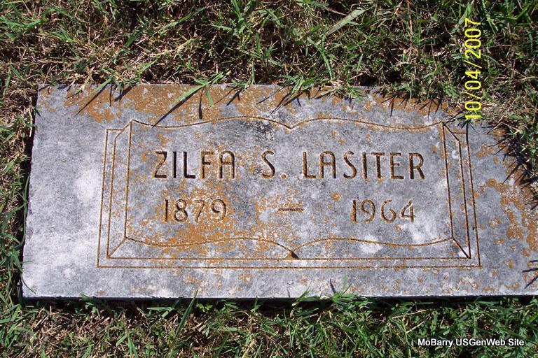 | LASITER, Zilfa S. (BUTLER) | 1879 | 1964 | Research Note: Her husband's name was Albert Preston Lasiter and they married July 1, 1900 in Stone Co., MO. John Jeremiah and Rachel (Hilton) Butler were her parents. John's grave is two graves away from Zilfa's grave. | MO Marriage Records Census Donna Cooper Note Photo Diana Cope |
