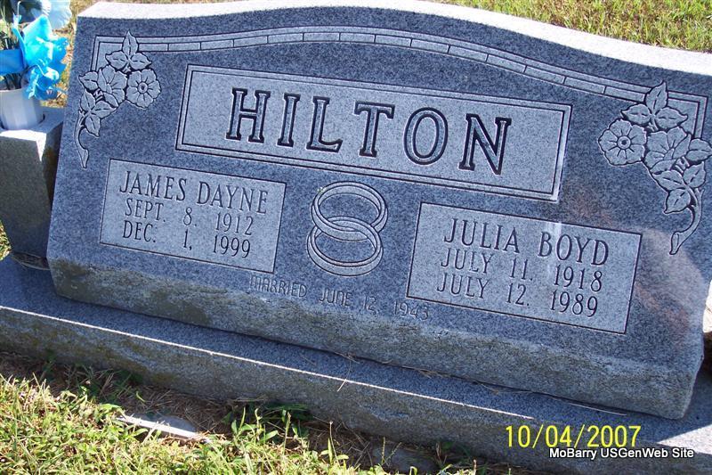| HILTON, James Dayne | Sept. 8, 1912 | Dec. 1, 1999 | SSW: Julia Boyd - Inscription: "Married June 12, 1943" - Research Note: Mt. Vernon resident. Mr. Hilton was a retired laborer for MFA Mill. Services will be noon tomorrow, December 4, at the Church of Christ in Scholten. Burial will be in Hilton Cemetery. - Son of George Benton Hilton and Edith Hester Bond. | Monett Times Phyllis Long Photo Diana Cope |