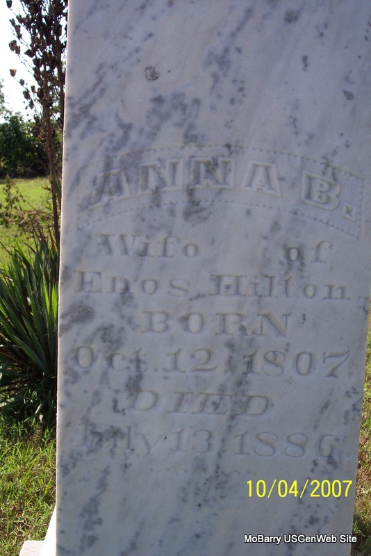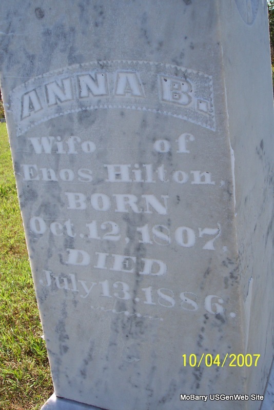 SSW: Anna B. Research Note: He was buried next to Anna B. Hilton. The land for the cemetery (Hilton cemetery) was donated by Enos Hilton, and the majority of the people buried there are direct descendants of the Hilton family. This is part of the biography about Enos in "History of Stone Co., Mo, Vol 1" by Stone Co Historical Society, page 474. Reverend Enos B. Hilton moved from Virginia to Missouri around 1840. His brother William also moved his family to Missouri around the same time. Enos settled in Barry County and William settled in Taney County. The Hilton Cemetery near Scholten, Missouri, gets its name because it was part of the old Enos Hilton farm. Enos passed away in November of 1884 and was buried on the farm which he loved so much. Enos and his sons, William, John Anderson, James, Matthew and Martin, were Federals during the Civil War. - He was the son of Samuel Hilton and Nancy Bird. He first married Susanna Burke about 1823 in Scott Co., VA. He second married Anna Bell Bailey on Oct. 13, 1833 in Scott Co., VA. Father of 13 children. - Another Photo | Stone Co. History Phyllis Long Photo Diana Cope |