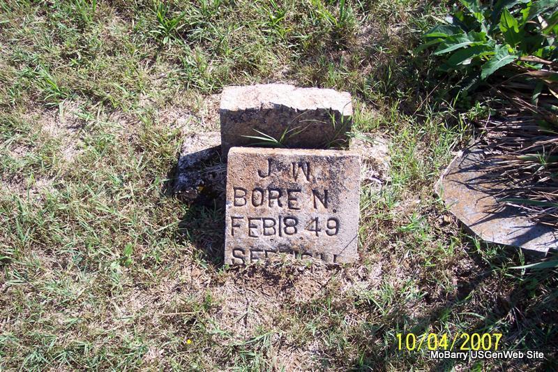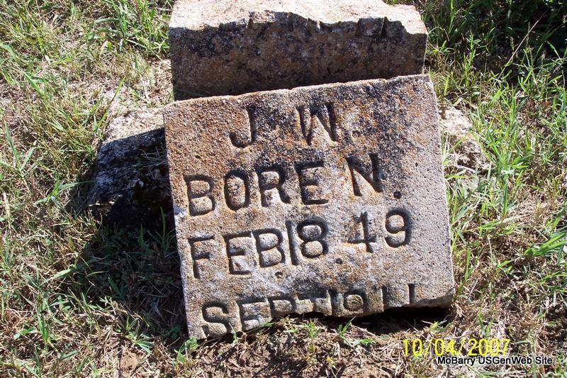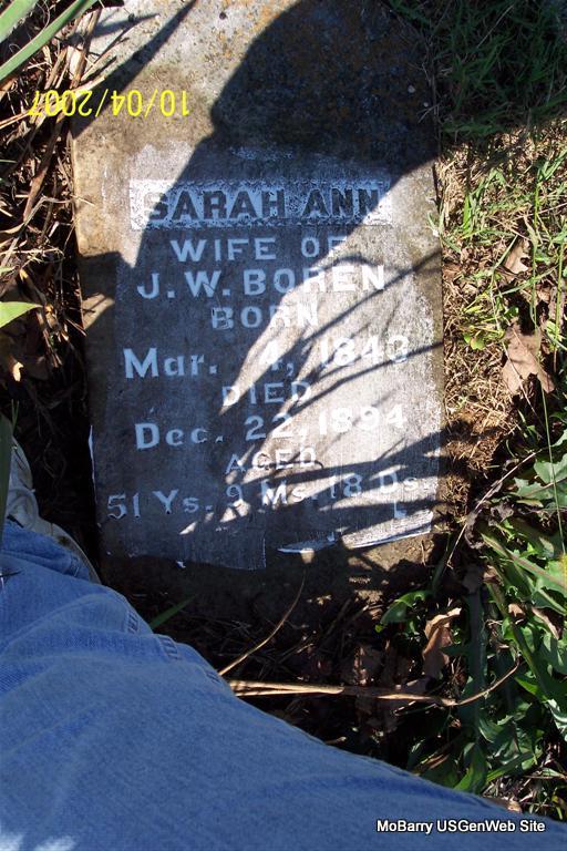 Research Note: He was married to Sarah Hilton, a daughter of Enos and Anna (Bailey) Hilton. His stone is broken and off the base. - P. J. Sheridan's note: James Wesley Boren was the son of E. P. Boren and Millie Holman. James W. Boren married Sarah Ann Hilton, daughter of Enos Bird and Anna Belle (Bailie) Hilton of Scholten, Missouri, on Dec. 15, 1867 in Barry County Missouri. James and Sarah Hilton Boren were the parents of 11 children. According to death dates and census records, James second married Sarah E. Fisher with Fisher children as step-children in the 1900 census. - Another Photo | Note Donna Cooper Census Phyllis Long Photos Diana Cope |