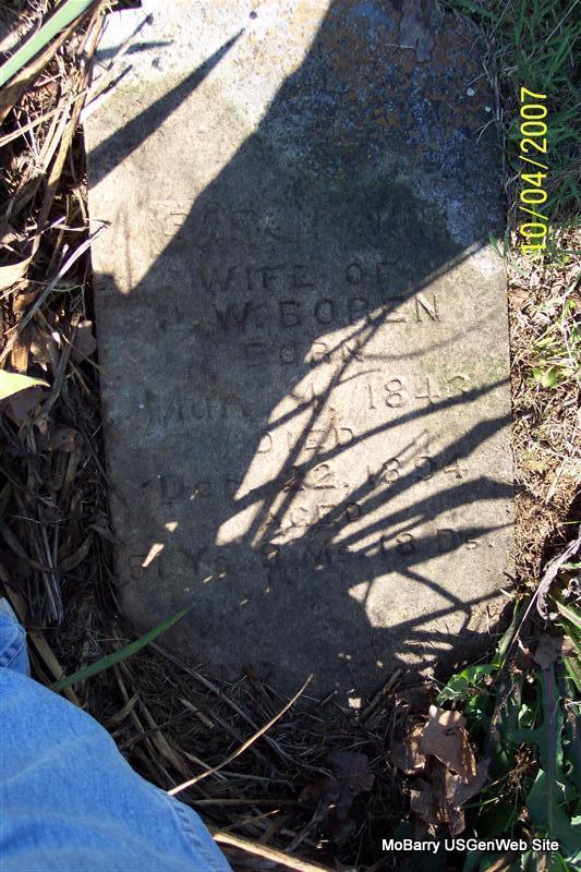 Inscription: "Wife of J. W. Boren - Age 51 Ys. 9 Ms 18 Ds" - Research Note: Sarah was a daughter of Enos and Anna (Bailey) Hilton. - P. J. Sheridan's note: Sarah Ann Hilton Boren was a daughter of Enos Bird and Anna Belle (Bailie) Hilton. Called Sary Ann by family, she married James Wesley Boren Dec. 15, 1867 in Barry County, Missouri. They were the parents of 11 children. - December 27, 1894, Cassville Republican - Mrs. Sarah Boren, wife of John (James) Boren, was buried at the Hilton grave yard, Sunday. She was up visiting relatives and had been in bad health for some time. - Another Photo | Note Donna Cooper Online Newspapers Phyllis Long Photos Diana Cope |