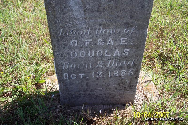 | DOUGLAS, Infant | Oct. 13, 1885 | Oct. 13, 1885 | Inscription: "Infant daughter of O. F. and A. E." - Research Note: Otis Freeman Douglas and his wife Alice Elizabeth Peters were the parents. Alice was a daughter of Alfred and Eleanor (Hilton) Peters. | Note Donna Cooper Photo Diana Cope |