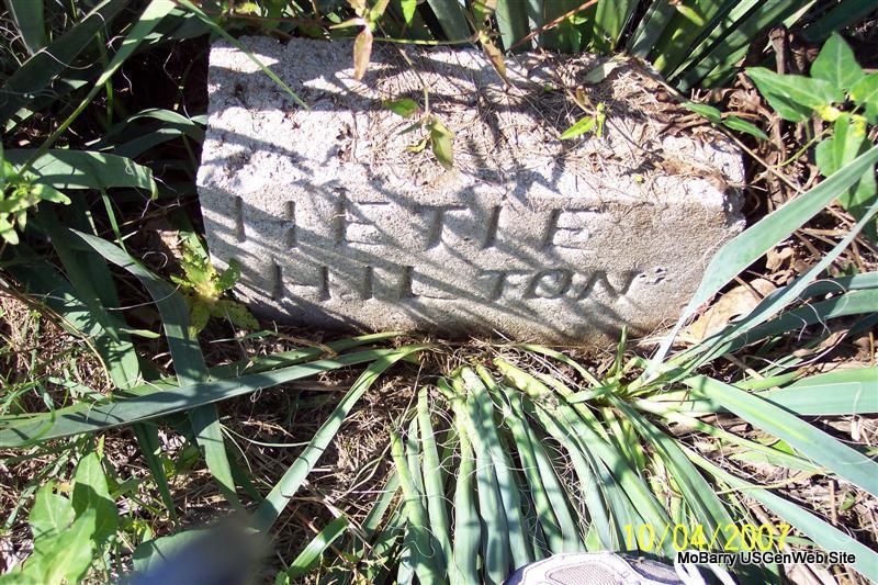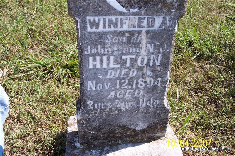 | HILTON, Winfred A. | Mar. 27, 1892 | Nov. 12, 1894 | Inscription: "Son of John and N. J. Hilton - Aged 2 yrs. 7 mo. 11 da." - Research Note: Son of John S. Hilton and Nancy Jane Thomas. | Note Phyllis Long Photo Diana Cope |
