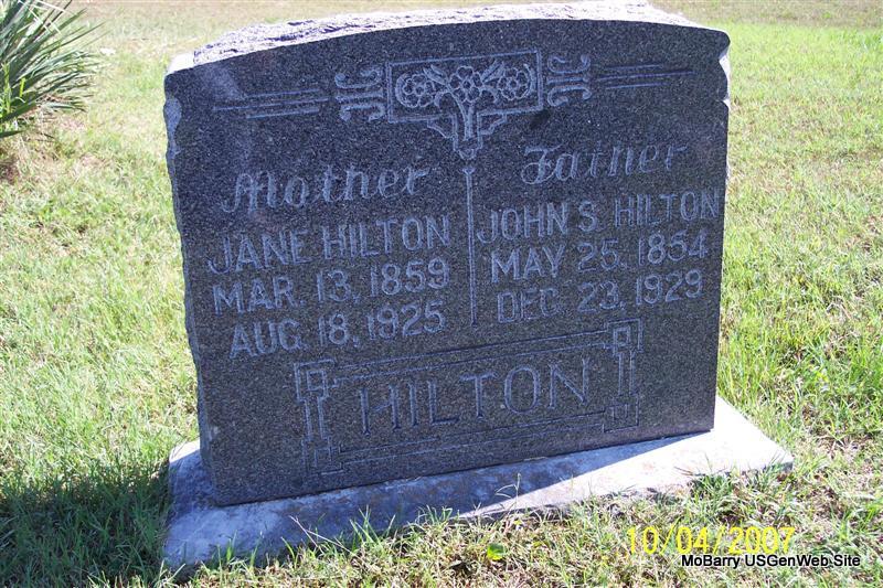 SSW: John S. - Research Note: Nancy Jane died of apoplexy, bill charged to John S. Hilton. She was married and member of the Church of God. Her father was listed as William Thomas. - Her death certificate names John S. Hilton as her husband and William Thomas, born Alabama, as her father. Hattie Sizemore, Sulpher Springs, AR, gave the information. - Nancy J. Thomas married John Hilton on June 7, 1874 in Barry Co., MO. Daughter of William F. and Phebe C. Thomas, buried at Leann Cemetery. | King Funeral Home Death Certificate Jay Trace MO Marriage Records Phyllis Long Photo Diana Cope |