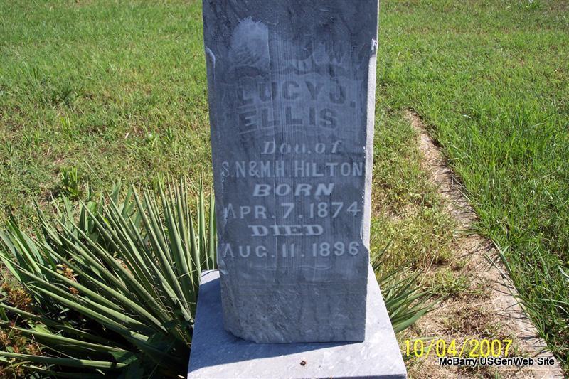 | ELLIS, Lucy Jane (HILTON) | Apr. 7, 1874 | Aug. 11, 1896 | Inscription: "Dau. of S. N. and M. H. Hilton" - Research Note: Albert Ellis was her husband. Daughter of Samuel Newton Hilton and Mary H. Thomas. - Cassville Republican, September 3, 1896 - Scholten News: Died Aug. 17th, Lucy Ellis, nee Hilton, supposed to have been afflicted with quick consumption. - Hilton Graves - Lot from Distance | Note Donna Cooper Online Obit Phyllis Long Photos Diana Cope |