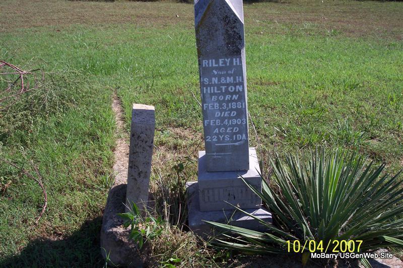| HILTON, Riley Haden | Feb. 3, 1881 | Feb. 4, 1903 | Inscription: "Son of S. N. and M. H. Hilton - Aged 22 Yrs. 1 Da." - Research Note: This stone is needs some base work done so that it won't fall over. Son of Samuel Newton Hilton and Mary Hepsebeth Thomas. - Another Photo - Hilton Graves - Corner Stone - Lot from Distance | Census Phyllis Long Photos Diana Cope |