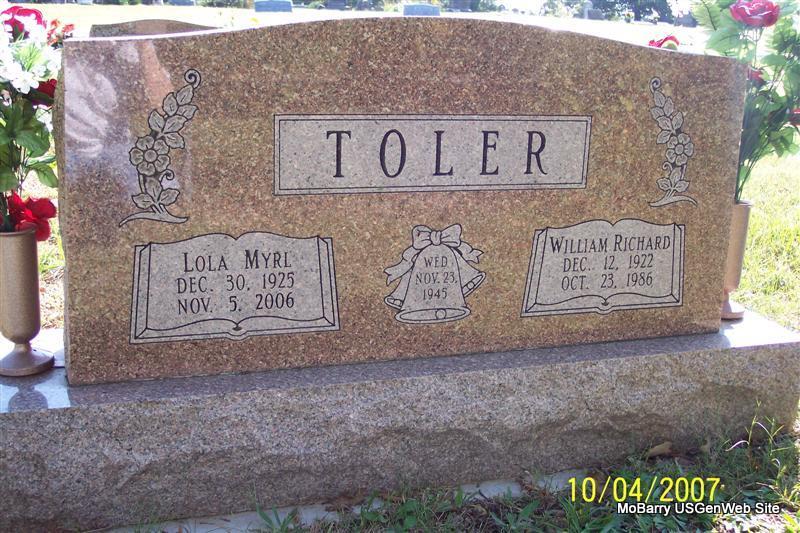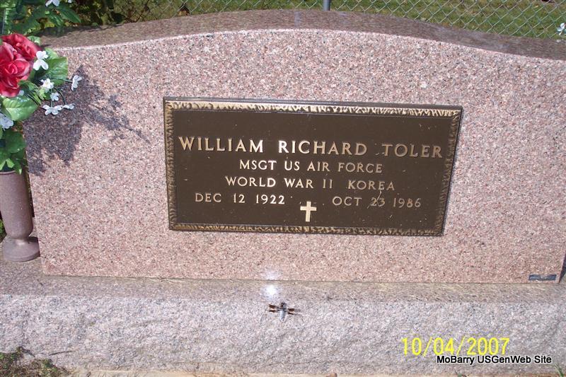 SSW: Lola Myrl - Inscription: "Wed Nov. 23, 1945" - Research Note: Son of Absalom Vandorn Toler and Lottie Jane (Gwin) (Osborn) Toler. - Back of Stone - Inscription: "MSGT US AIR FORCE WORLD WAR II KOREA" | Census Phyllis Long Photos Diana Cope |
