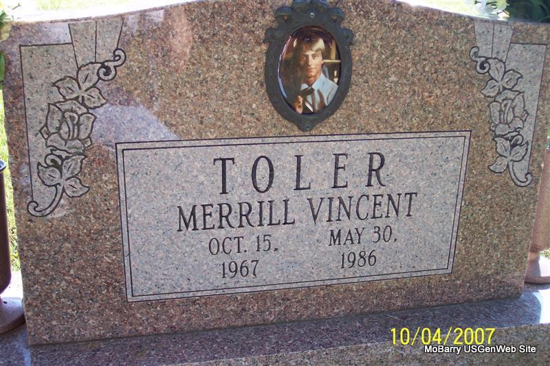 | TOLER, Merrill Vincent | Oct. 15, 1967 | May 30, 1986 | Research Note: His photo is on the stone. Son of William Richard Toler and Lola Myrl Seitz. Cause of death was a car accident. | Note Phyllis Long Photo Diana Cope |