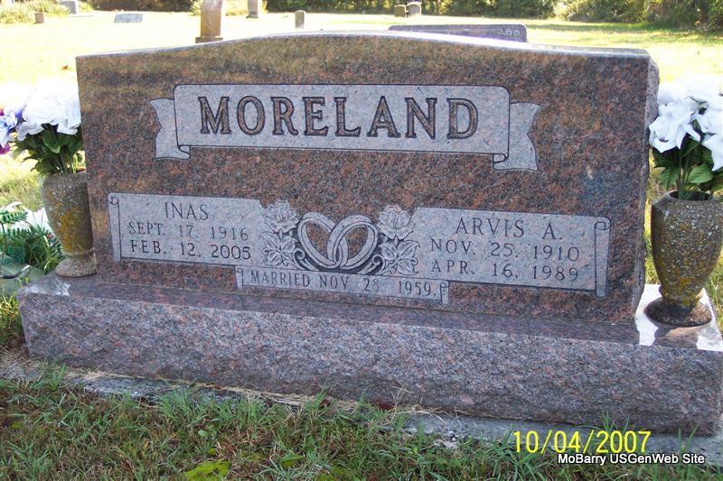 | MORELAND, Inas | Sept. 17, 1916 | Feb. 12, 2005 | SSW: Arvis A. - Inscription: "Married Nov. 28, 1959" - Research Note: Second wife of Arvis Moreland. | Note Phyllis Long Photo Diana Cope |