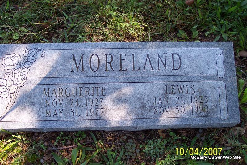 | MORELAND, Marguerite | Nov. 24, 1927 | May 31, 1972 | SSW: Lewis - Research Note: Might be Marguerite? Lewis Moreland, age 21, married Betty Griffin, age 18, on Nov. 6, 1944 in Benton Co., AR. Both were from Jenkins, Barry Co., MO. | AR Marriage Records Phyllis Long Photo Diana Cope |