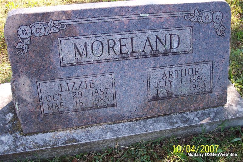| MORELAND, Mary Elizabeth "Lizzie" (COLLINS) | Oct. 29, 1887 | Mar. 18, 1983 | SSW: Arthur - Research Note: Daughter of Henry Jasper Collins and Sarah Arlena Carter. Arthur Moreland married Mary E. Collins on Sept. 3, 1904 in Howell Co., MO. | MO Marriage Records Census Phyllis Long Photo Diana Cope |