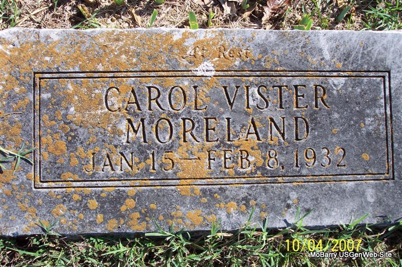 Research Note: His death certificate reads that his father was named Henry Moreland, born in AR and his mother was Pauline Carney, born Barry Co., MO. Mother had typhoid fever when pregnant and so the child was under developed. Henry Moreland gave the information. Robert posted this one as Vester, the death certificate listed him as Carrol Vester and the stone reads Carol Vister. | Death Certificate Donna Cooper Headstone Robert Moreland Photo Diana Cope |