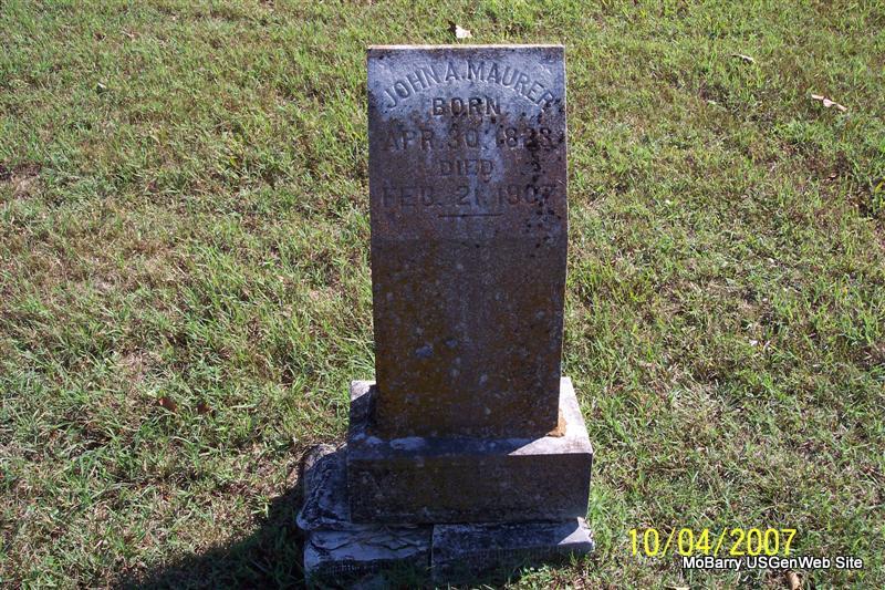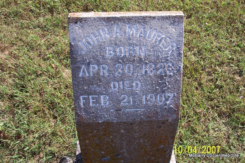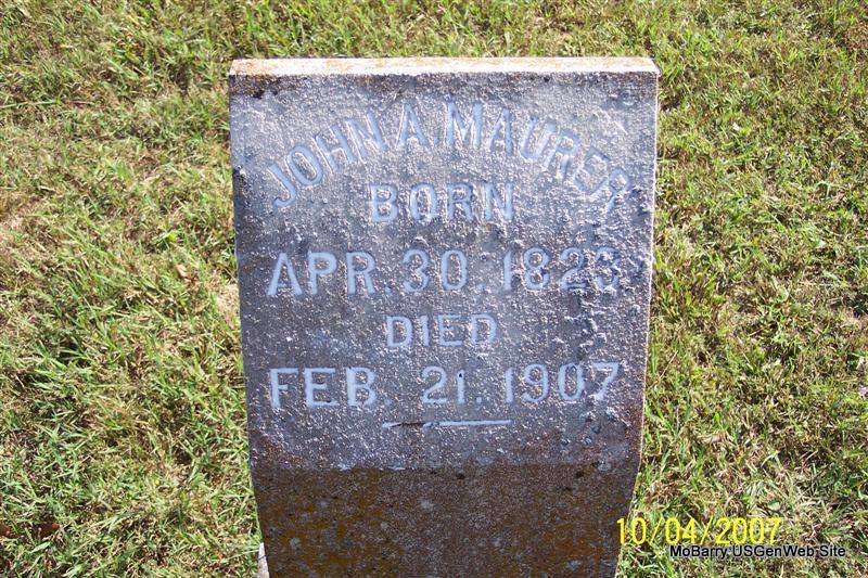 | MAURER, John | Apr. 30, 1823 | Feb. 21, 1907 | Research Note: He was married to Sarah Masoner, daughter of Hiram Masoner and Margaret McCoy. Sarah is buried in Morris Hill Cemetery Boise, Idaho. She married John on Jan. 13, 1869 in Miami Co., Kansas. She and John only had one child, William, who married Gertrude Reese in 1900. By 1910 they were in Idaho. William and Gertrude both died in Oregon. John was first married to Mary Johnson, daughter of Enoch Johnson. They married on December 6, 1857 in Blue Township, Jackson Co., Missouri. Mary and John were divorced in 1865 in Leavenworth Co., Kansas. According to papers in John's pension file John and Mary had a daughter named Katie. Mary supposedly married Augustus Myers after her divorce from John. - 1900 Census, Crane Creek Twp., Barry Co., MO - Maurer, John, Head, born Apr. 1824, age 76, married 31 years, born GER, parents born GER Maurer, Sarah, Wife, born Jan. 1850, age 50, married 31 years, born MO, parents born TN; Maurer, Willie, Son, born Nov. 1877, age 22, born MO; Maurer, Gertrude, Daughter-in-law, born Apr. 1882, age 19, born MO. - Another Photo - Another Photo | Note Jean Masoner Census Phyllis Long Photos Diana Cope |